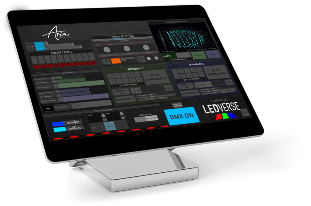 La UI (User Interface) permette all’utente finale di gestirlo, creare i suoi effetti, modificare gli effetti preinstallati, salvarli, e mandare le scene in play, senza particolari conoscenze tecniche.